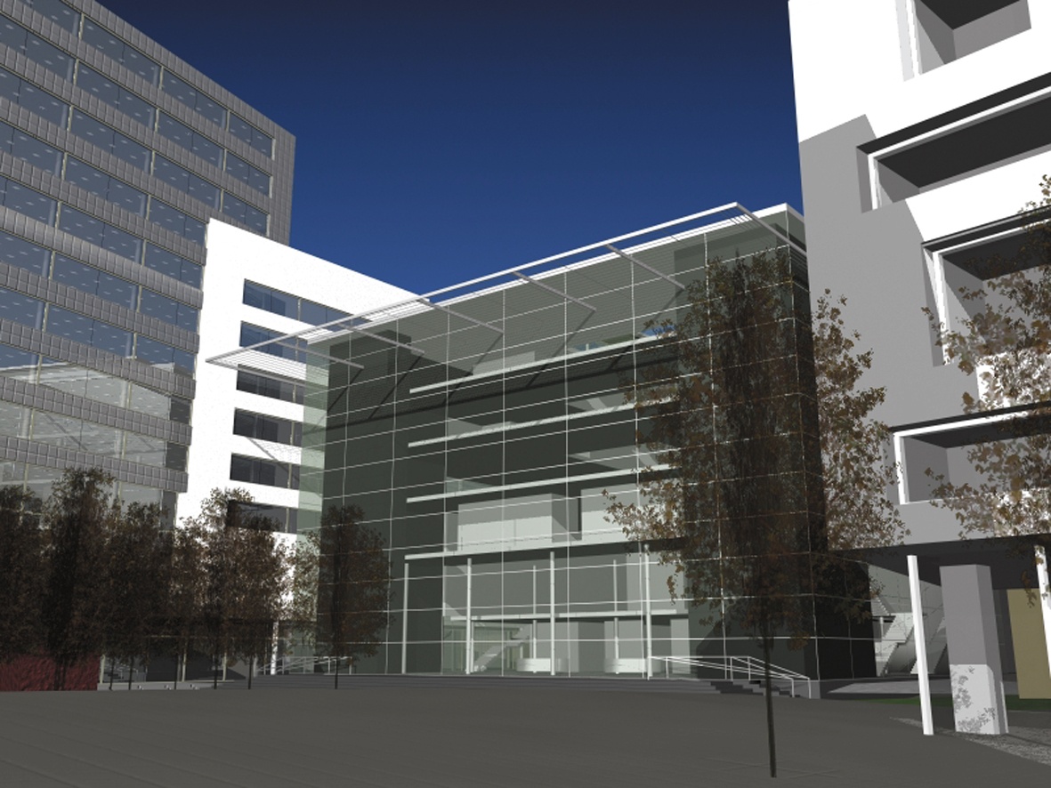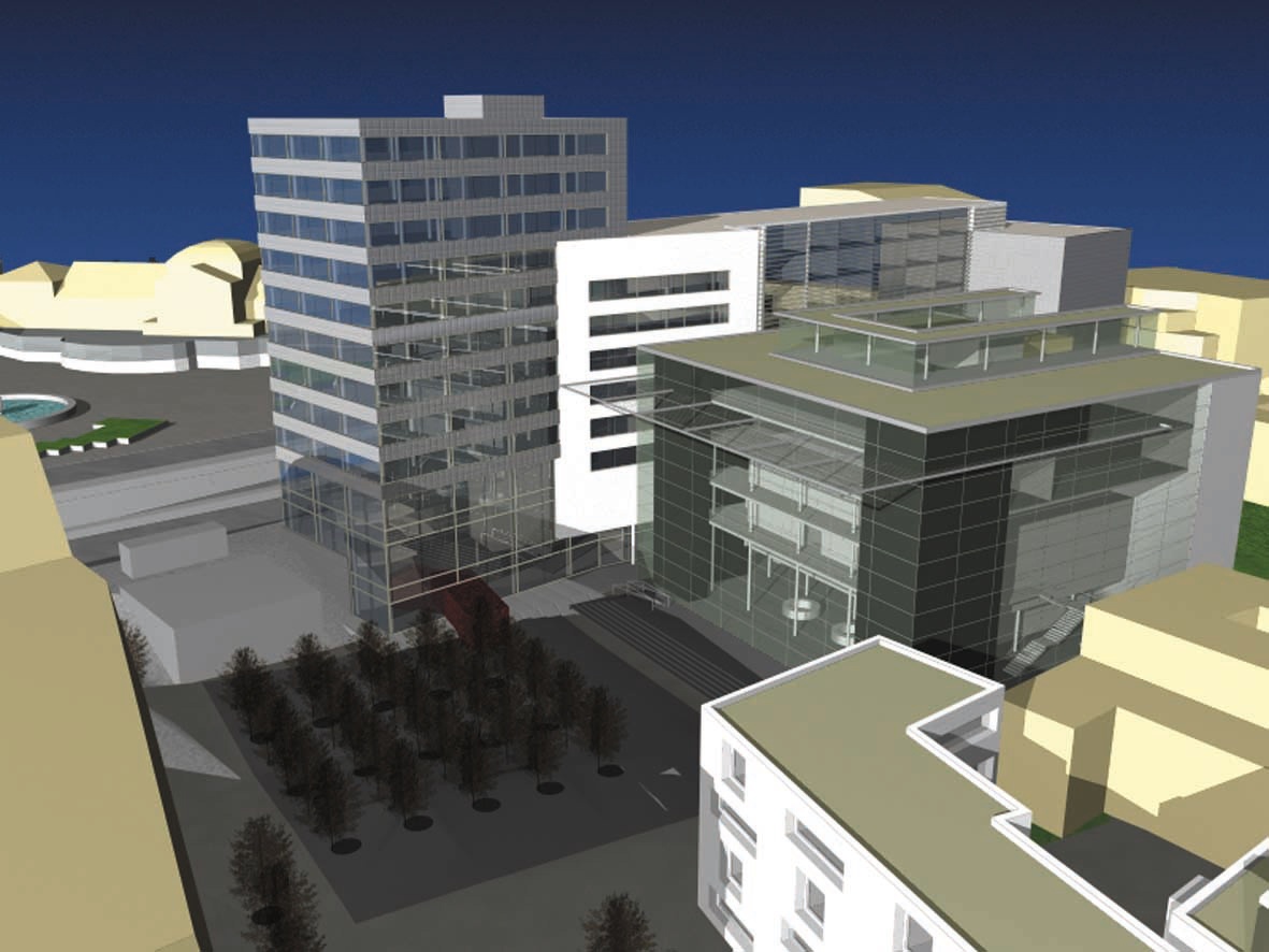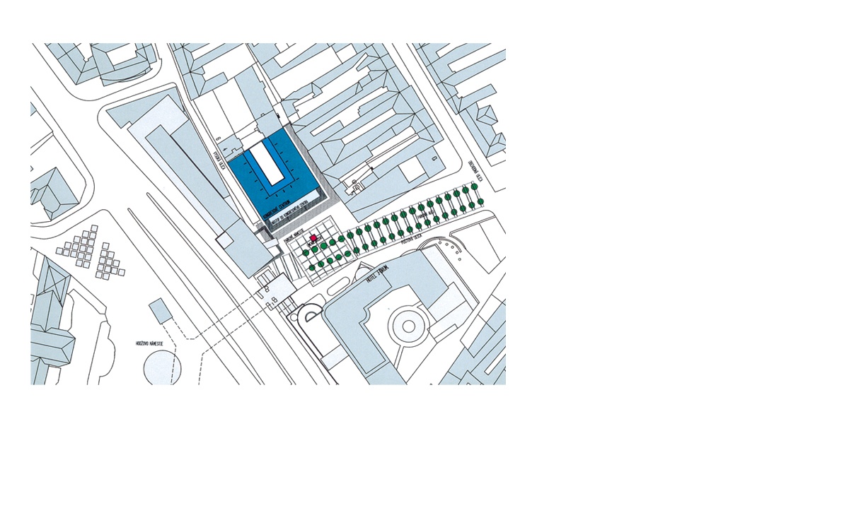This was part of a plan to accumulate governmental offices in the center of Bratislava near the presidential palace. Forum Hotel (now Crowne Plaza), which stands opposite, was supposed to offer accommodation for participants of governmental and inter-state negotiations. These should have taken place on the grounds of the new congress building planned in the neighborhood around Tatracentrum. This venue for the highest level meetings and appointments ambitiously manipulated the effect of transparent facade. A larger volume of glass-coated shell with industrial elements surrounded another, smaller structure containing a congress hall. On the street, one of the main thoroughfares and lively pedestrian streets of the town, a glass façade of a congress center was supposed to have supported a projection on a mega-screen, and so, at least symbolically have become a public issue.