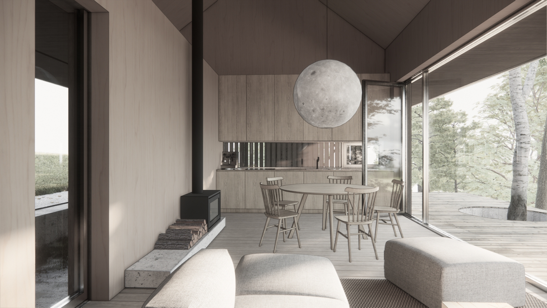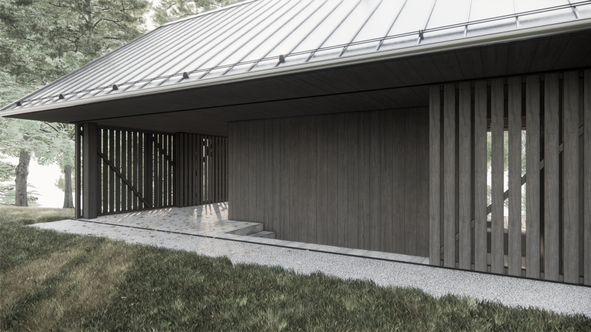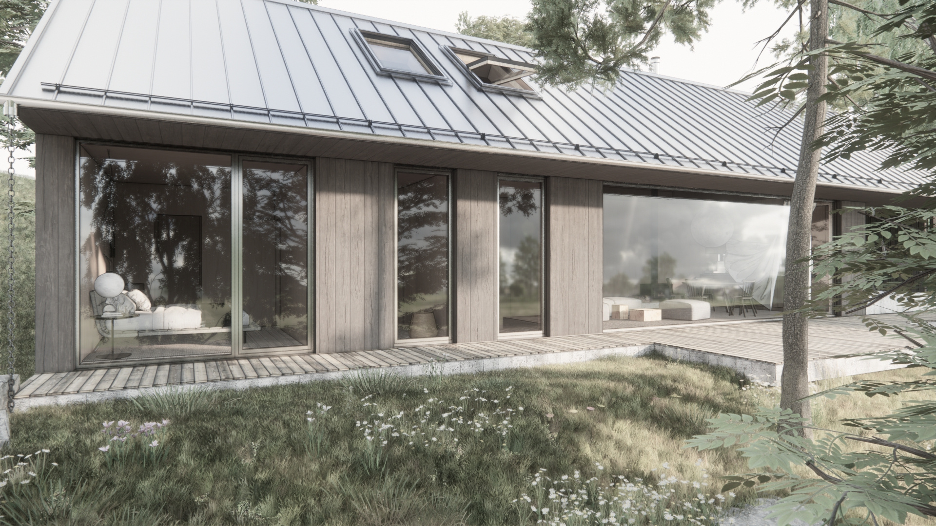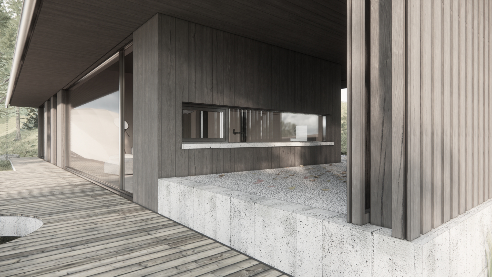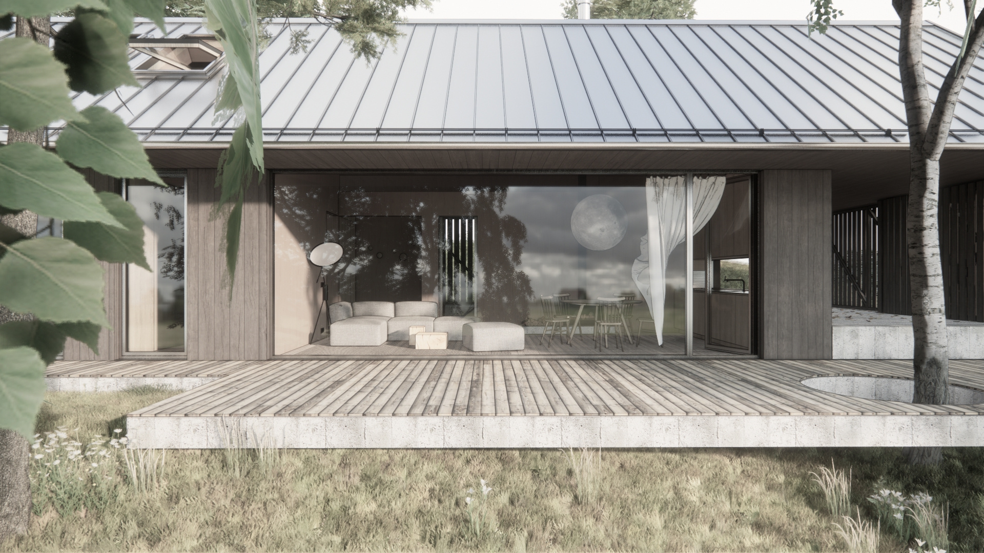 Na brehu rybníka, s výhľadom na Štiavnické vrchy. Žiadne výrazné prvky, len tiché splynutie s prostredím. Víkendy a dovolenky na tomto mieste majú byť predovšetkým o oslave prírody a tomu podlieha aj forma a mierka rekreačného domu. Jednoduchá prízemná drevostavba krytá sedlovou strechou zľahka evokuje drevené humno. Dom spolu s terasami jemne koriguje fyzickú náročnosť strmého svahu bez toho, aby zásadne menil jeho prirodzený charakter. Napriek tomu nie sú potrebné žiadne kompromisy v komforte s plne vybavenou prevádzkou s dostatkom obytného priestoru a súkromia. spolupráca: Eugen Kullman
