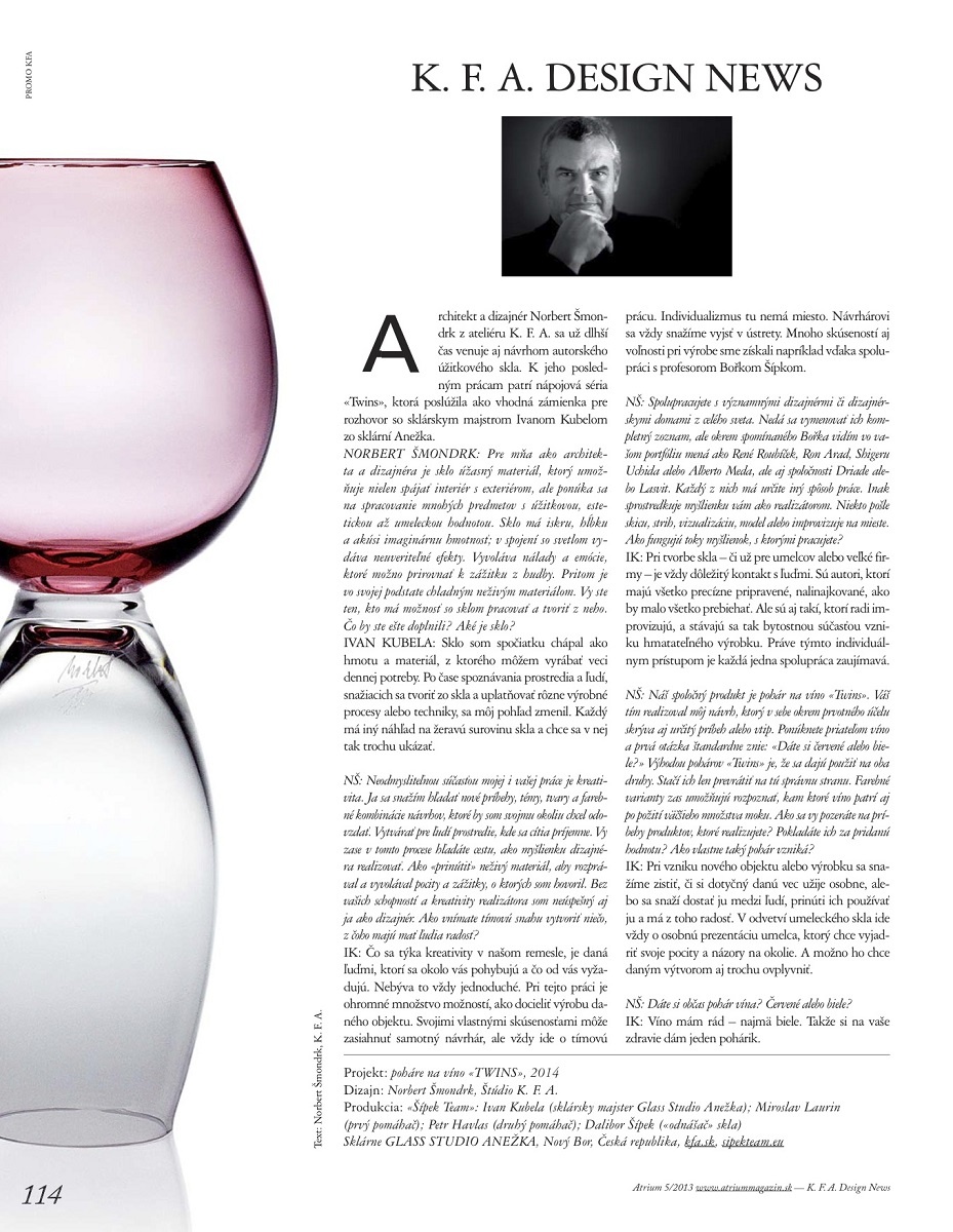 Ron Arad, René Roubíček, Driade, Lasvit a, samozrejme Bořek Šípek – známe české sklárne Anežka majú za sebou rad výnimočných skúseností s tvorbou autorského skla. Nápojová súprava Twins vznikala práve v tejto svätyni sklárskeho majstrovstva. O skle a o spolupráci s dizajnérmi je aj rozhovor Norberta Šmondrka s Ivanom Kubelom.