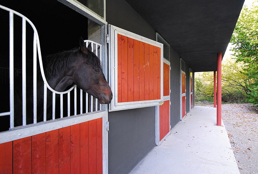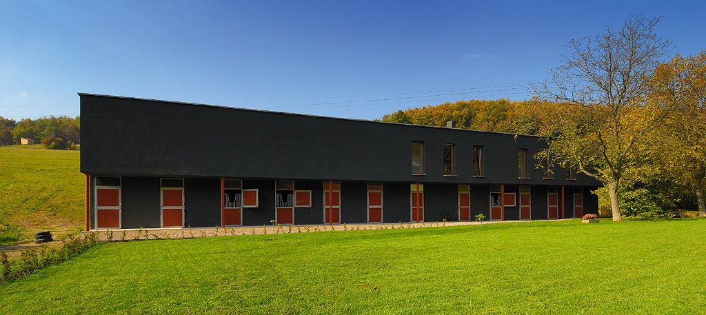 This settlement of Nová Baňa gradually reduces its density towards the mountains, until becoming completely dispersed among the meadow and mixed forest covered hills. Right here, in a county in which construction activities occur only very tentatively, the building of new stables for racehorses has met with the topic of contemporary architecture probably for the first time. Horses, with their relaxed lives have ideal conditions here; there is enough fresh pasture and a space to exercise. The stables, housing professional equipment, therefore ideally complements the framework for breeding. The disposition of the building is clearly readable from outside. On the ground floor the stables are accessible from two sides with the window and door facing the green courtyard. Access to the stable from the top is protected by the cantilevered upper deck supported by thin poles. A studio and living spaces is found upstairs. The expressive horizontal body of the stables is structured with a regular pattern of dark red wooden wings, alternating with doors and windows embedded in a white frame, which is perhaps the only reference to traditional stables.