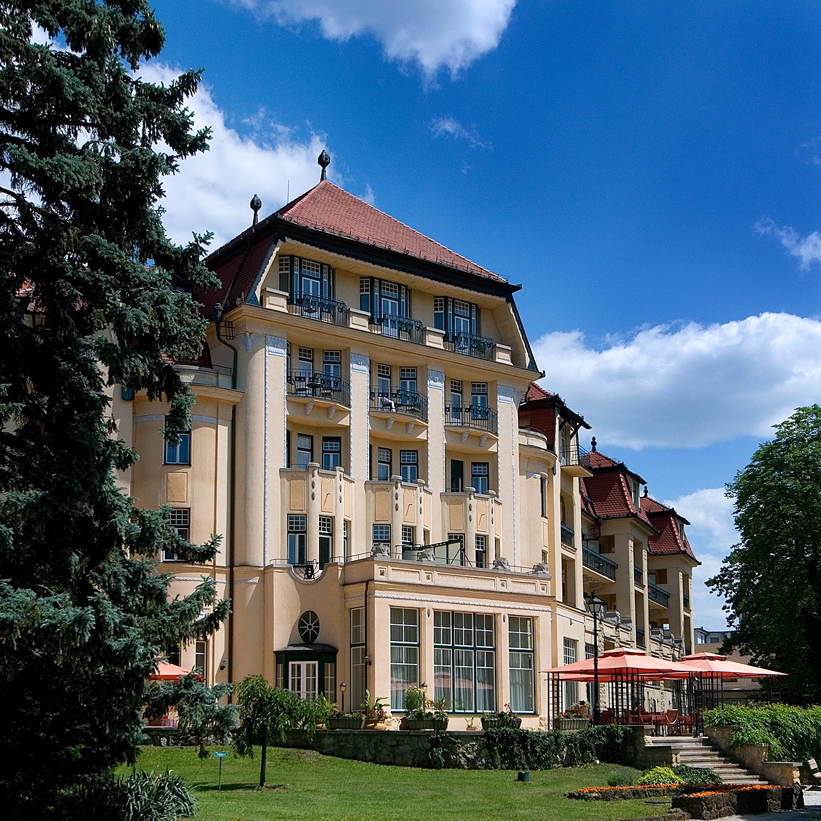 Ešte začiatkom 20. storočia všade navôkol stáli kúpeľné domy a penzióny komorných rozmerov. Budapeštianski architekti Henrik Böhm a Ármin Hegedűs sa však pri projekcii novej pýchy kúpeľného ostrova riadili mierkou európskeho formátu. Thermia Palace spolu s priľahlým liečebným domom Irma dostavali v roku 1912 a ich secesno-eklektický naturel vniesol do Piešťan žiadaný závan buržoáznej noblesy. Kompletná rekonštrukcia komplexu v roku 2006 z neho spravila luxusný päťhviezdičkový hotel. Keďže Thermia Palace má svoje stále miesto v zozname národných kultúrnych pamiatok, témou zadania rozhodne nebolo zanechať na historickom objekte stopu po súčasných architektonických tendenciách. O to väčší dôraz sa kládol na podrobné štúdium pôvodného objektu a všetkých remeselných postupov, ktoré prispeli k jeho dobovej výnimočnosti. Z tohto pohľadu to bola pre architekta tá najlepšia škola. Rekonštrukcia prebiehala v spolupráci s ďalšími architektmi a výraznou mierou k výsledku prispel aj investor a architektka Gabriela Kvetanová z Krajského pamiatkového ústavu v Trnave. Foto: Soňa Sadloňová