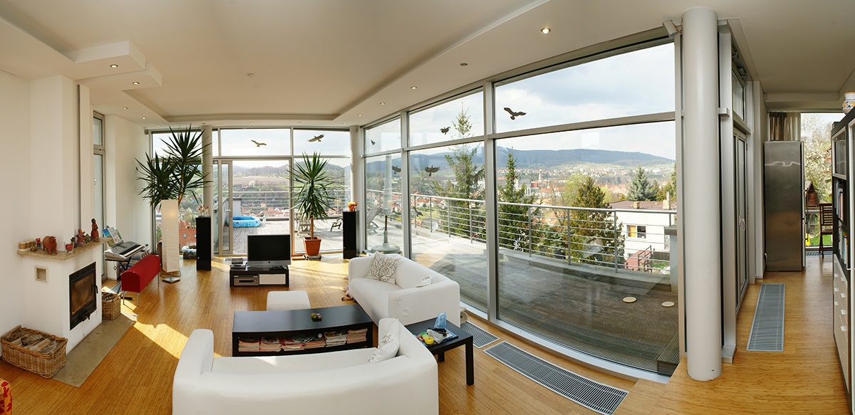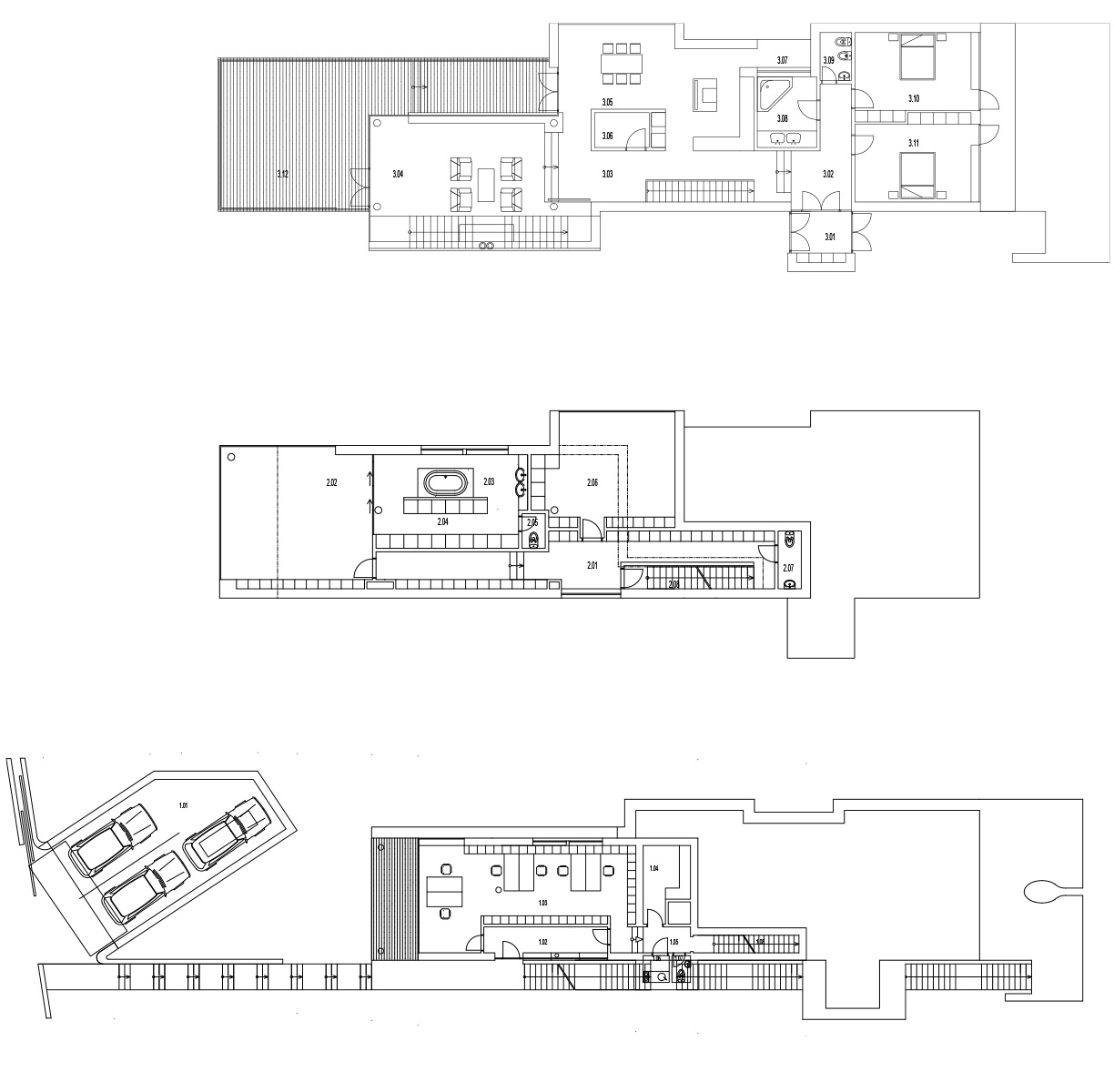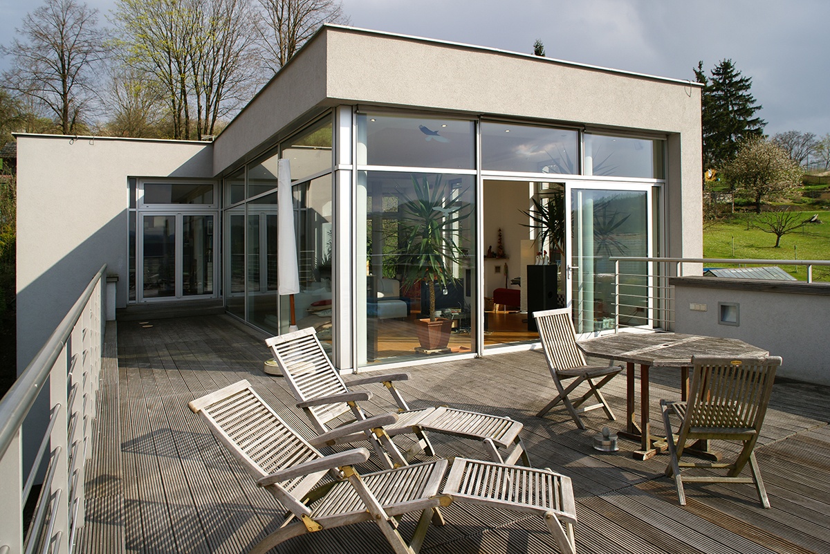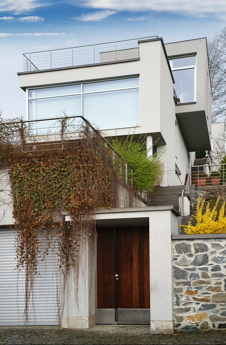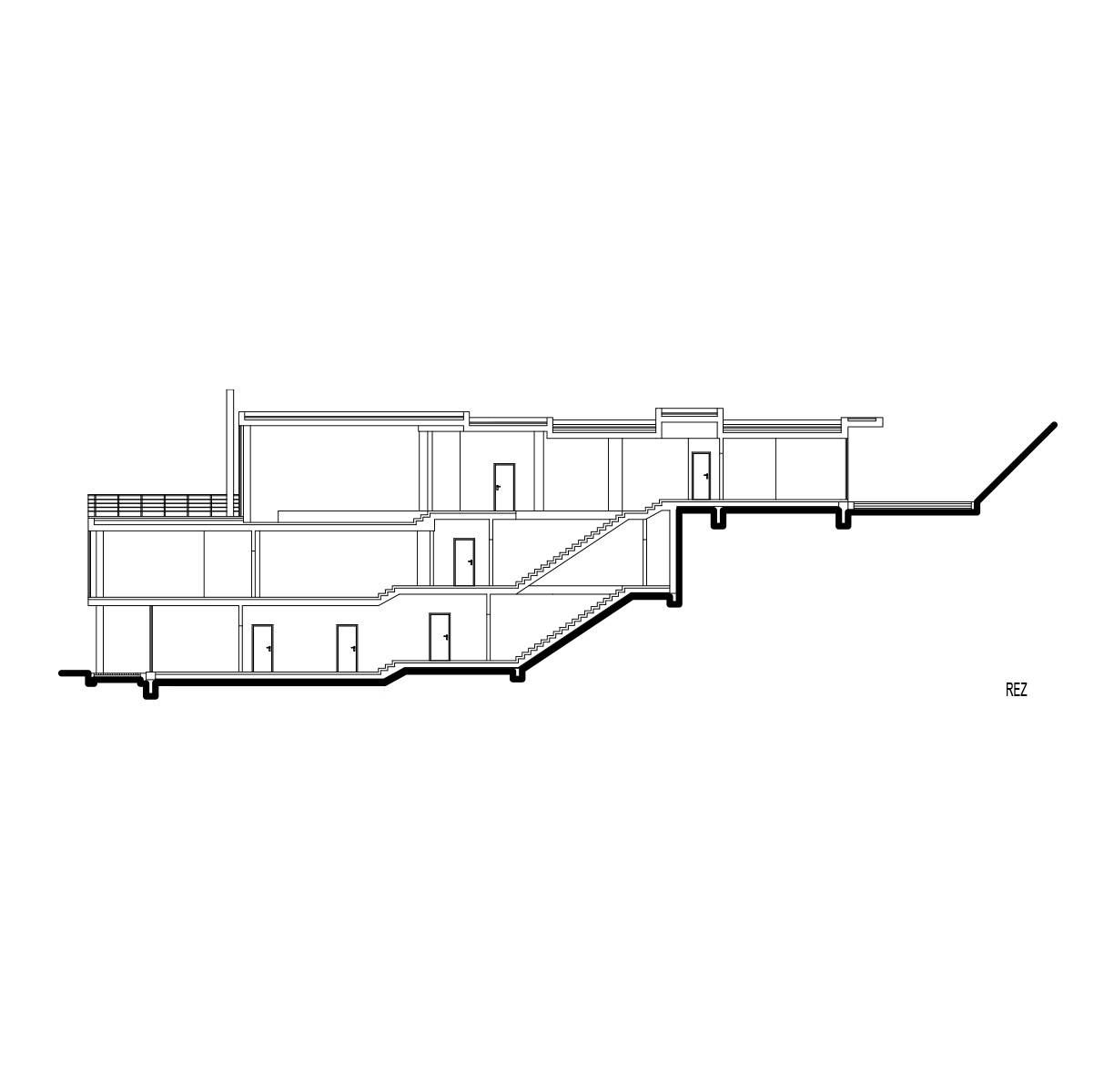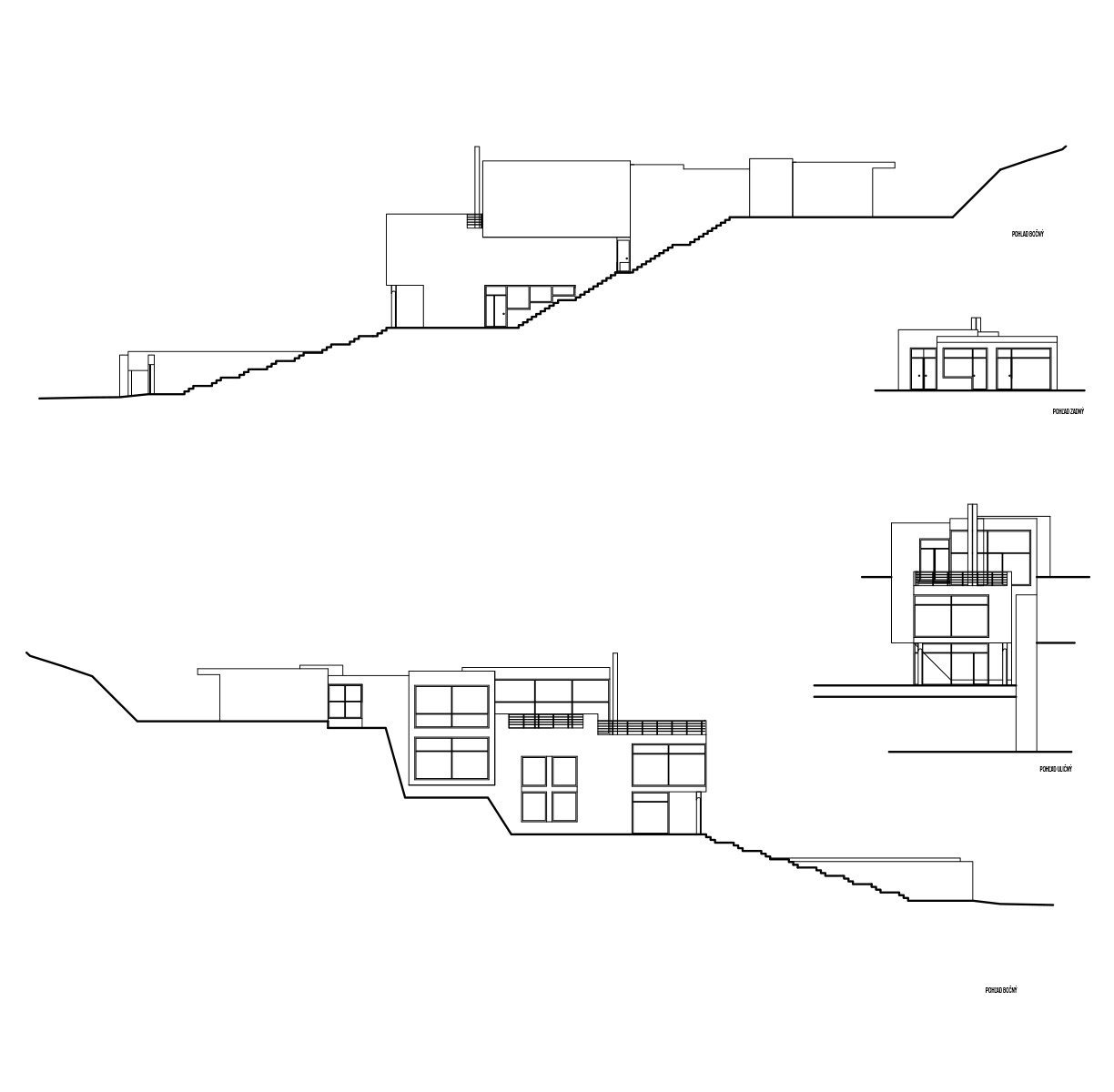 This villa stands at the foot of the valley surrounding the exceptionally beautiful historic city center. It uses every opportunity to take advantage of this rare scenic potential. From the terraced arrangement of materials on the steep slopes to the large, precisely cut rectangular glass areas - every point of contact with the environment is composed to highlight the experience of the clear views of the castle, town and countryside along with a meander of the Vltava. Rostislav Švácha, in the book Famous Villas of South Bohemia, writes that he even found some signs in the building of "neo-plastic" inspiration that Šmondrk transferred into contemporary neo-functionalism and minimalism. However, the implementation process later involved other subjects, and the material and color solutions especially show deviations from the original project. The villa's office space serves as a travel agency which includes offices along with a separated apartment above it.