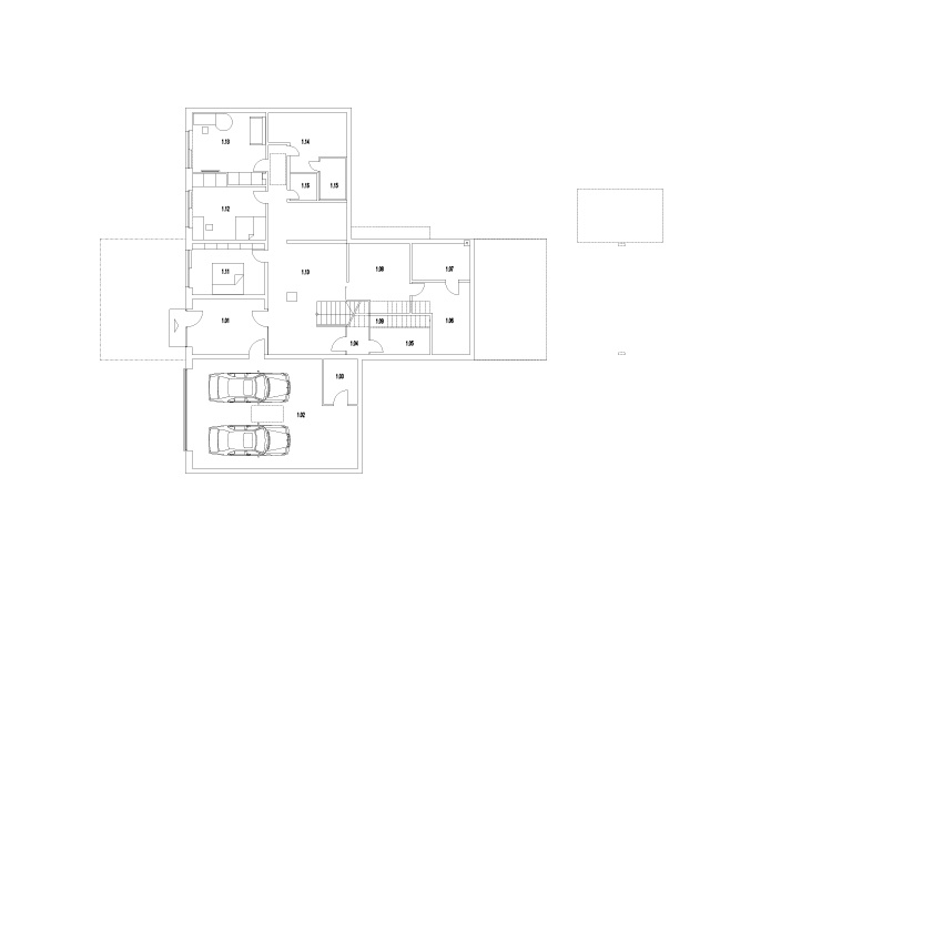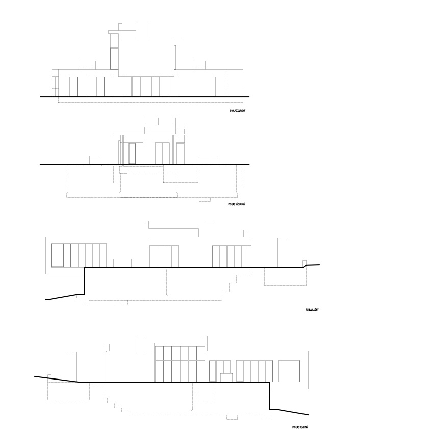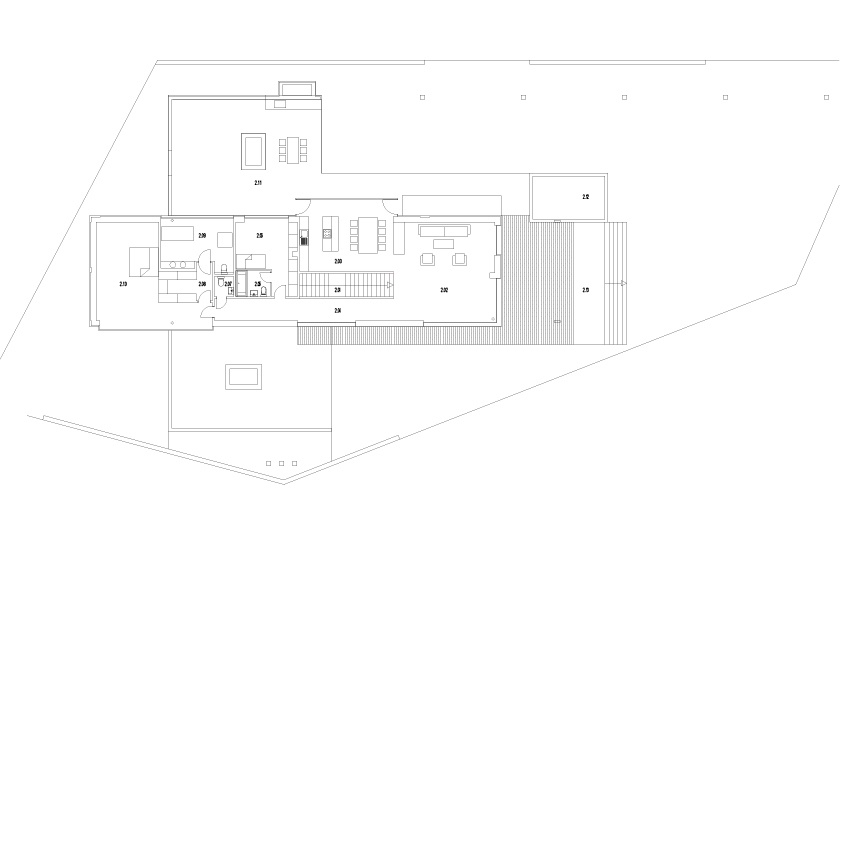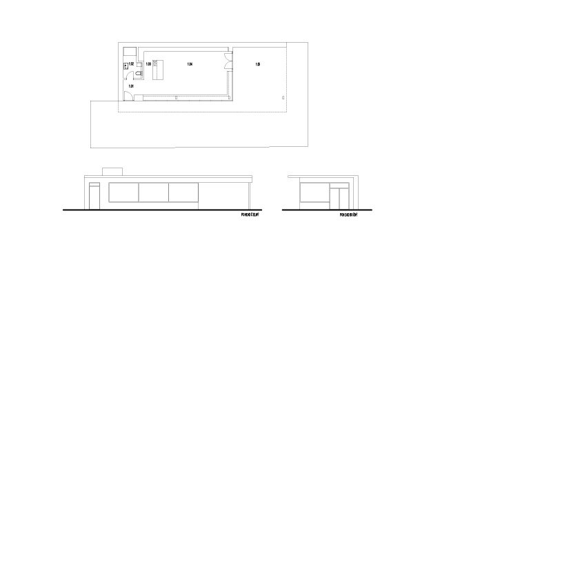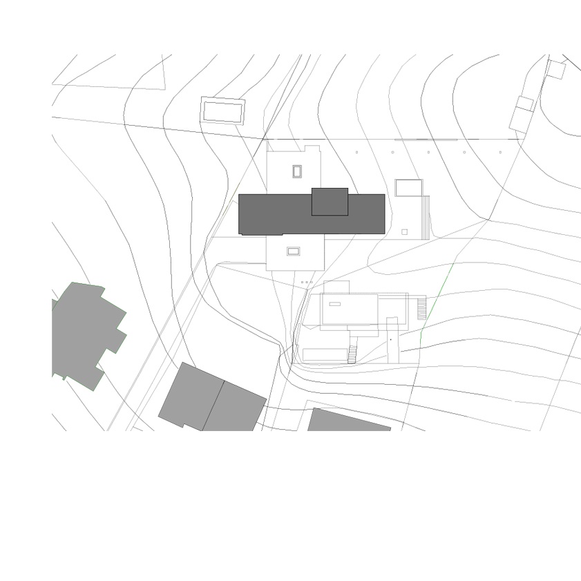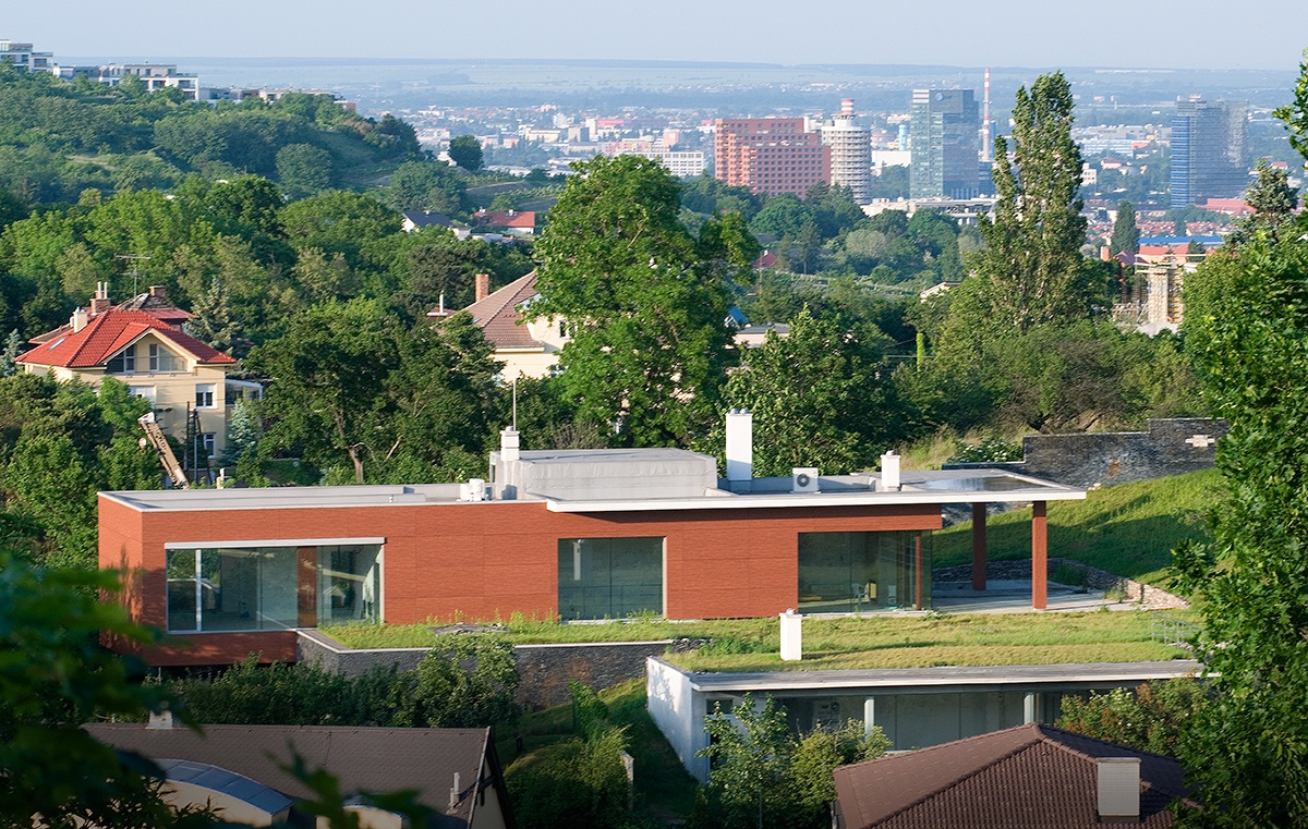The natural placement of the house in the terrain reflects the owner´s respect towards nature which is also very close to the architect himself. All building interventions therefore strive to be more than friendly to the original attributes of the nice sunny lot. Šmondrk unified the whole residential project in two simple perpendicular blocks. In order to maintain the original field profile he partially buried the lower block and he emphasized connection with the land through slate tiles. He covered the upper block with wooden facade panels. The lot has one more feature – a pavilion, in which the owner´s office is situated. It also has the ambition of blending in with the environment; the rear portion is therefore sunk into the ground and greenery as a carpet smoothly flows onto the vegetation roof.