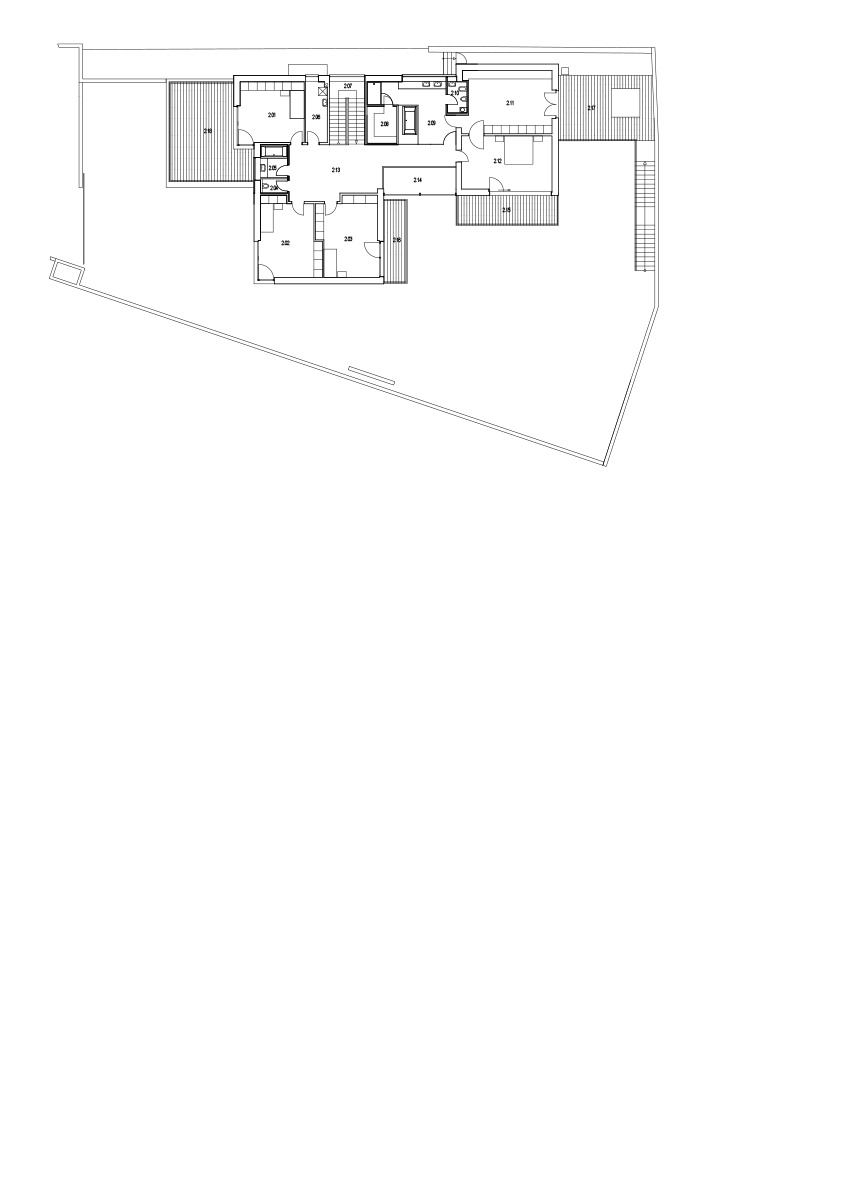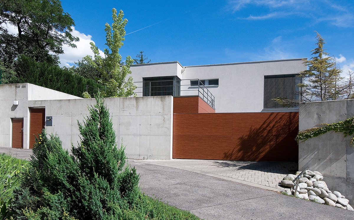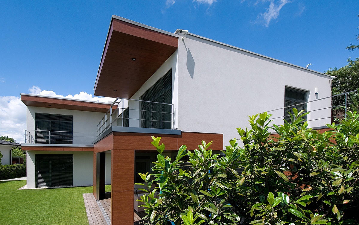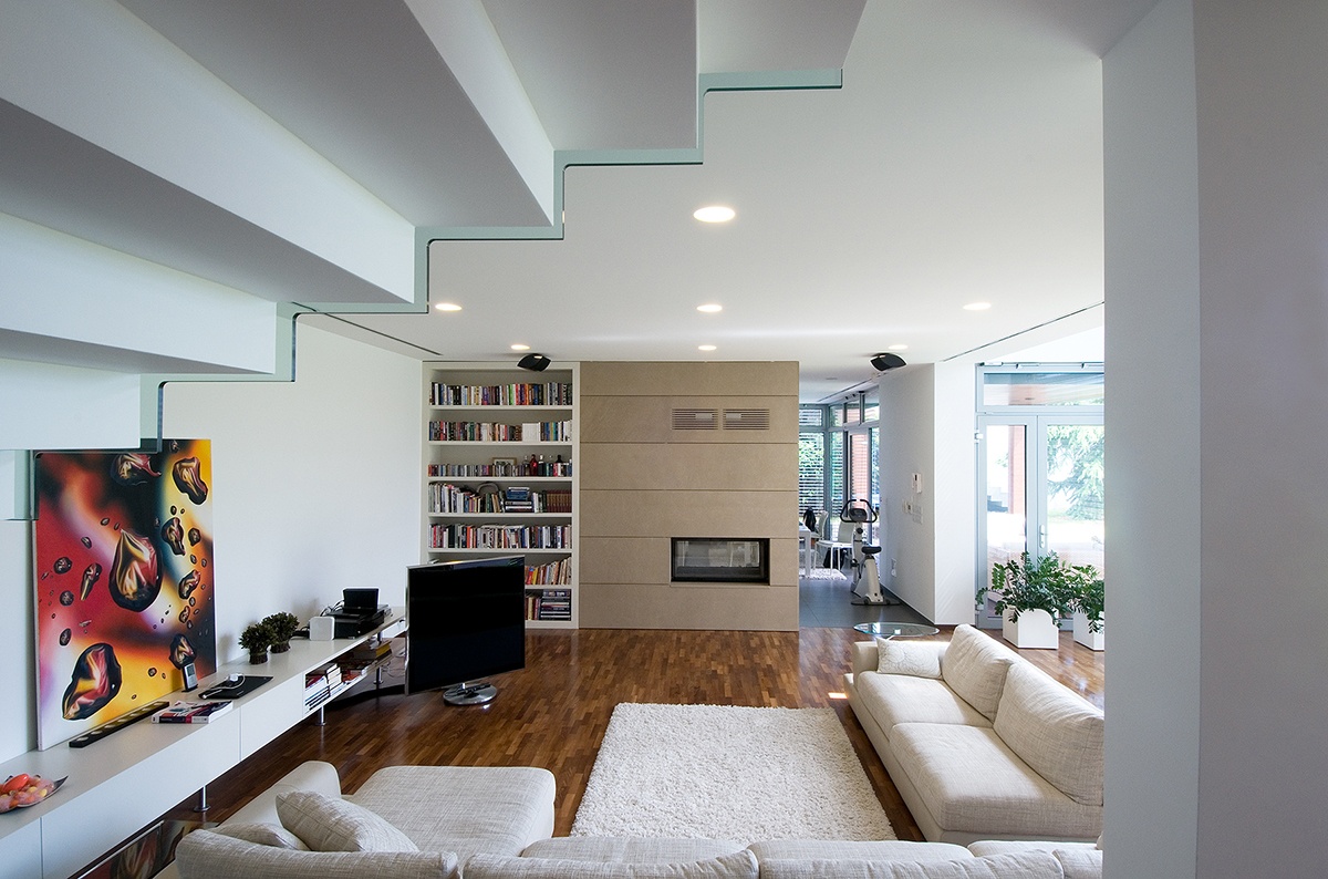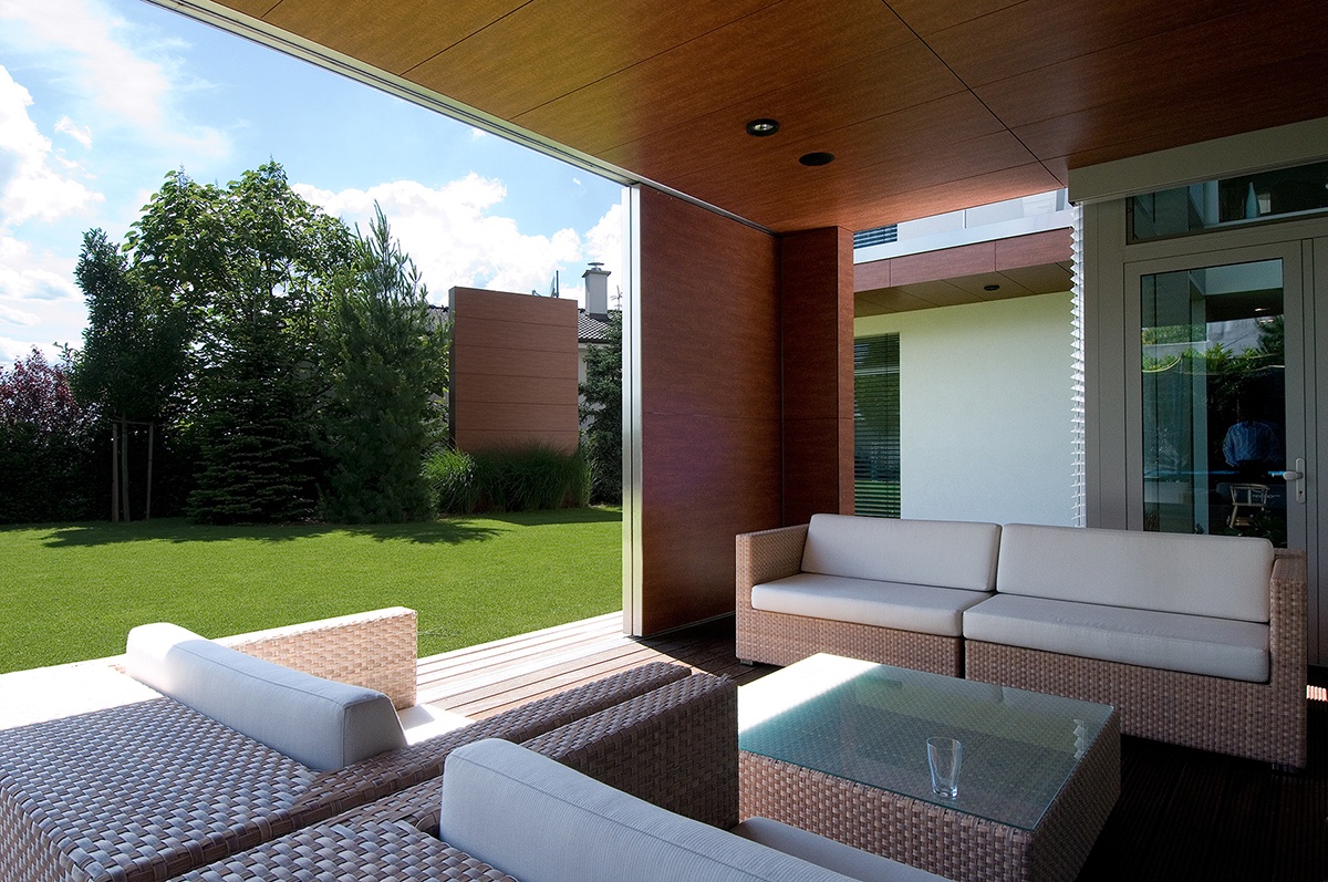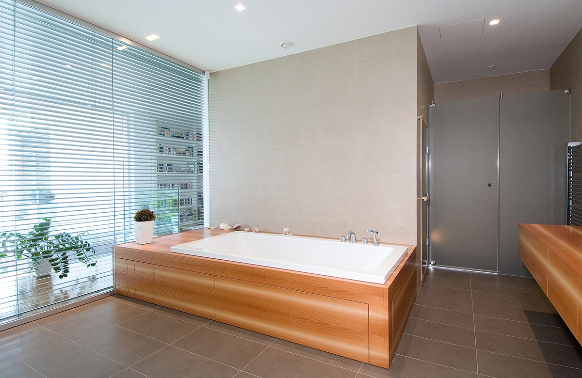 The view enjoyed from the bath through the glass wall is composed of a slight slope and on it a villa overlooking the town. Of course, the view could have been closed, but who would do that when it is indeed the bath where one can find time for quiet meditation. The villa fulfils the model of healthy living also in the sphere of ordinary lifestyle, if we understand the notion ‘healthy’ within the concept of adequately dimensioned and designed areas for both generations of the family, parents and children alike. The ground floor serves for common activities with generous daily contact with a garden. However, upstairs everyone has his autonomous territory. On the one side of the floor are three children’s rooms with private bathrooms and terraces and on the second side is the parents’ zone with a bedroom, workroom and the aforementioned glass bathroom. Of course, the villa is not lacking terraces. The interior is based on sophisticated detail and quality materials. Photo: Soňa Sadloňová